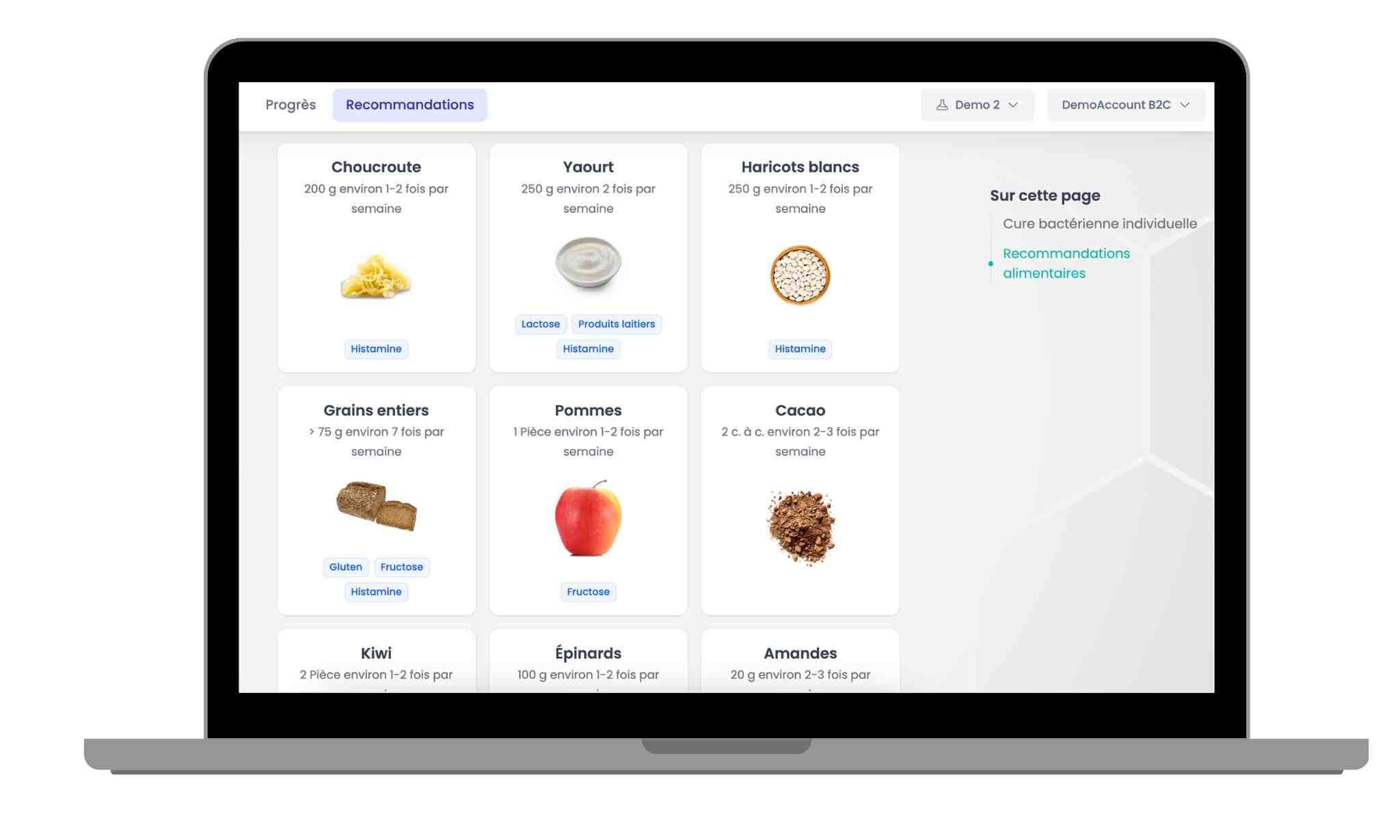 Notre analyse de microbiote fournit des scores détaillés pour suivre et améliorer la santé de votre microbiote. Elle inclut des recommandations personnalisées : une liste d'aliments à privilégier ou éviter, des conseils pour stimuler les microbes bénéfiques et inhiber les bactéries nocives, renforcer la paroi intestinale, réduire l'inflammation intestinale, et optimiser les niveaux de sucre sanguin.